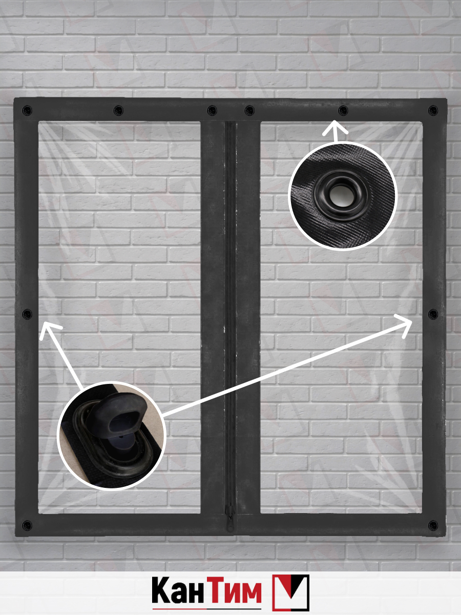По периметру мягкая дверь усилена коричневой окантовкой, устойчивой к влаге и износу. Крепление осуществляется при помощи круглых чёрных люверсов из оцинкованного алюминия, предназначенных для наружного применения и устойчивых к коррозии. Люверсы расположены по трём сторонам — сверху и по бокам, с шагом 40–55 см, что обеспечивает равномерное натяжение полотна и плотное прилегание к проёму.